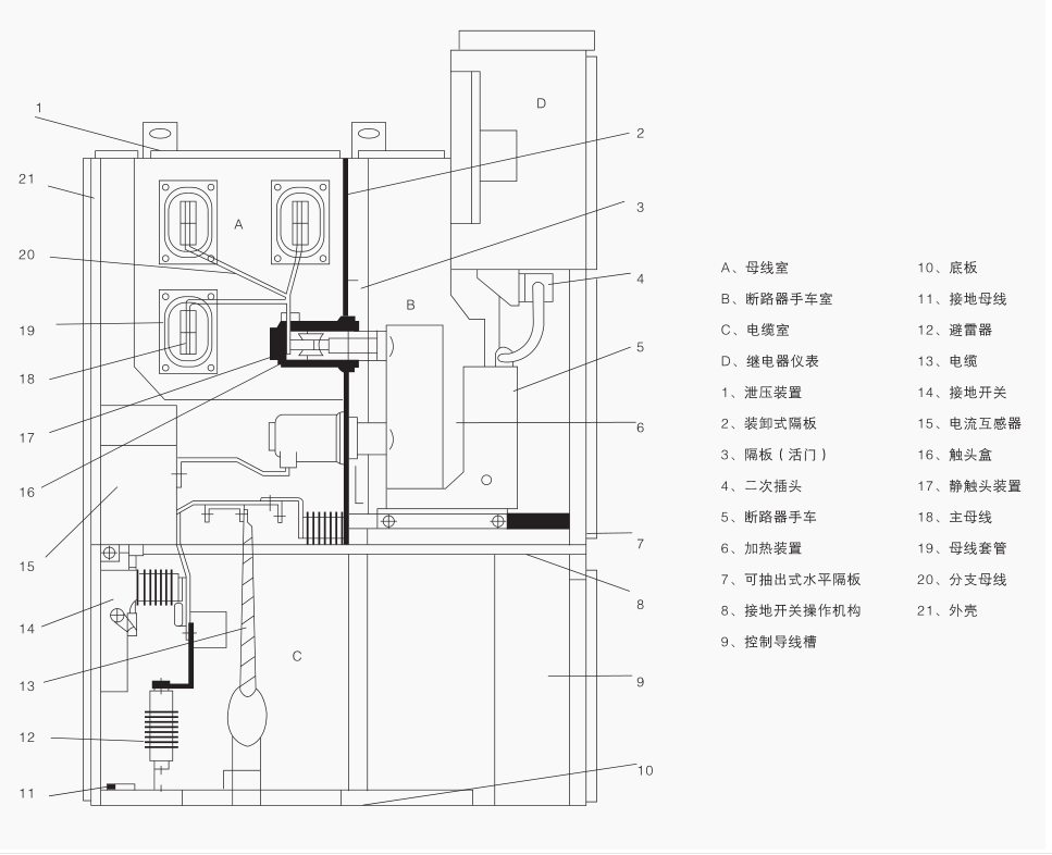 實行控制保護、監(jiān)測之用,本開關(guān)設(shè)備滿足DL/T40491,IEC298、GB3906等標(biāo)準(zhǔn)要求,具有防止帶負(fù)荷推拉斷路器手車、防止誤分合斷路器、防止接地開關(guān)處在閉合位置時關(guān)合斷路器、防止誤入帶電隔室、防止在帶電時誤合接地開關(guān)的聯(lián)鎖功能,實為一種性能優(yōu)越的配電裝置。